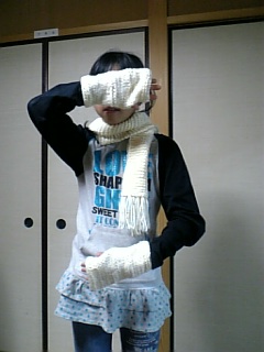 ガーター編みの長いマフラーとハンドウォーマーを編みました。