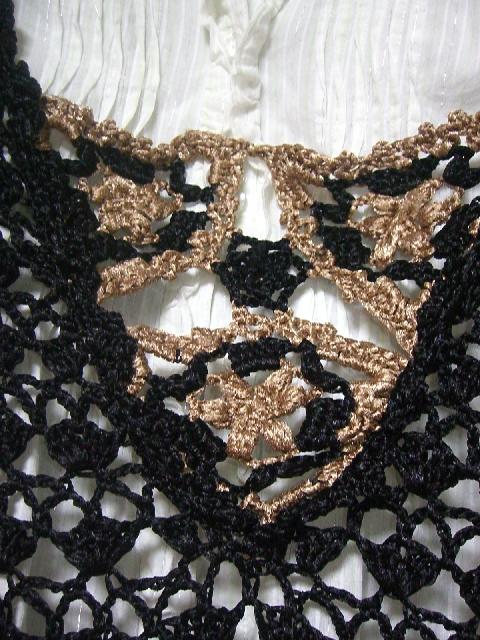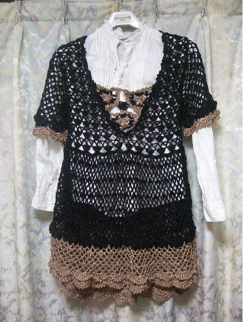 胸のあきが大きいデザインなんですが そでの重みにひっぱられて 肩がずり落ちてしまいそうなので モチーフをつけて あきを狭くしました。